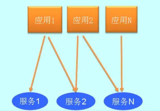 这里有两种类型的“应用”,应用1~N是前端应用,面向用户,服务1~N是service,只提供业务逻辑和数据。这些应用都是独立部署,前端应用不再通过API直接关联,而是通过后端服务共享业务逻辑。