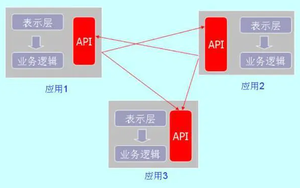 在分布式应用架构中,应用相互独立,每个应用代码独立开发,独立部署,应用通过有限的API接口互相关联。API接口属于应用一部分,一般和表示层处于同一层次,两者共享业务逻辑层,API和表示层采用同样的web端技术,通讯协议一般使用HTTP,数据格式是JSON,应用集成方式比较简化。