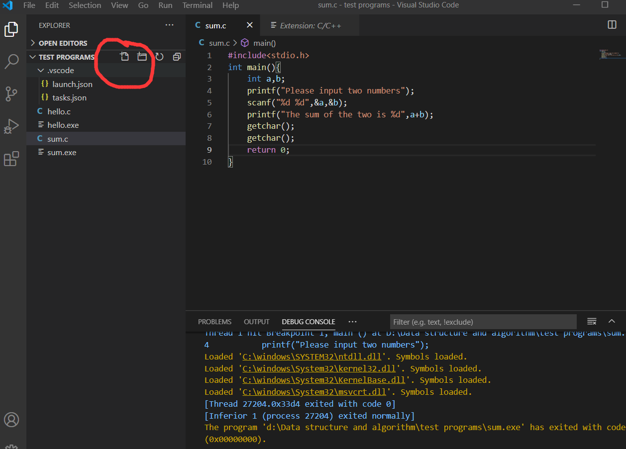 新建一个后缀为.c 或.cpp的文件,然后可以写入一个最基础的程序,CTRL+S保存,按F5进行调试
