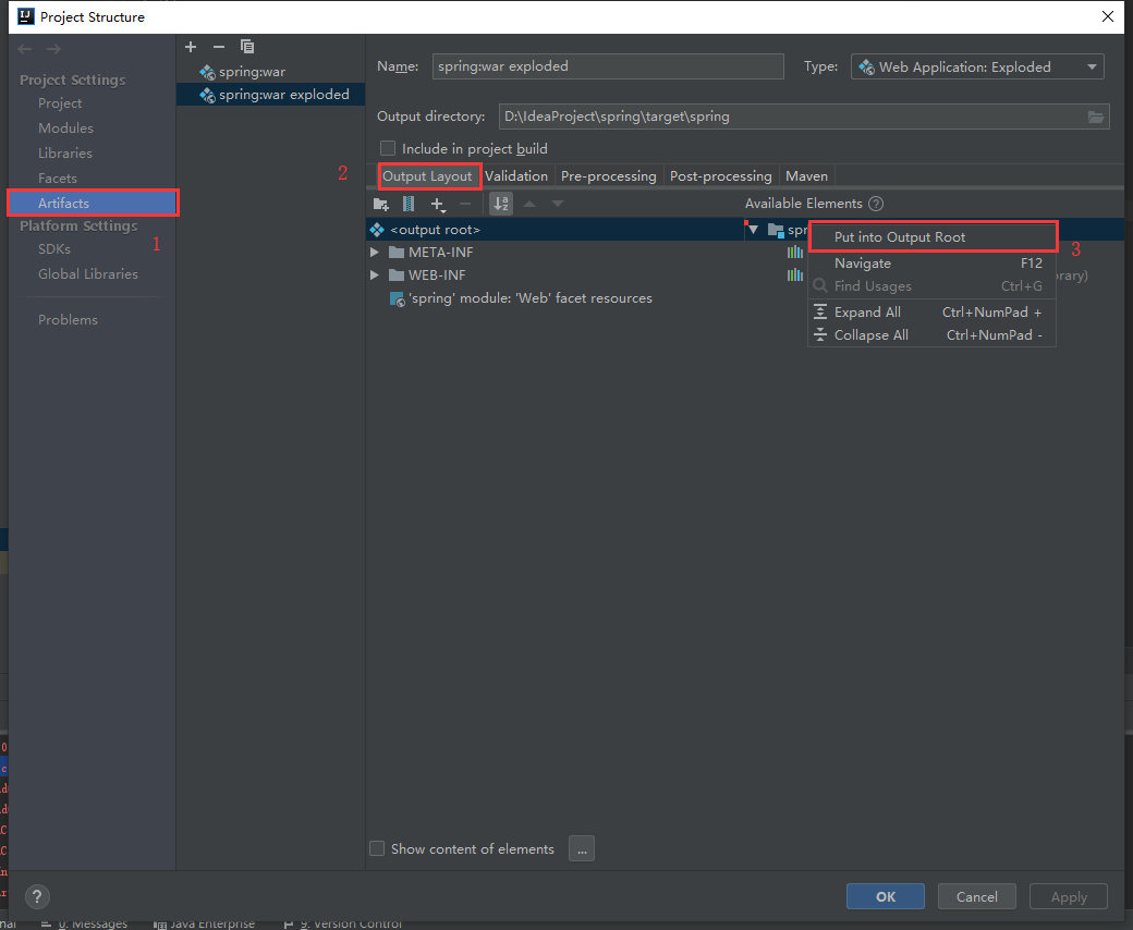 右键单击Available Elements下面的项目名称,选择Put into Output Root
