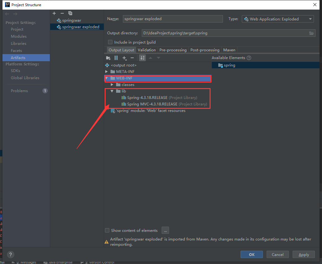 File->Project Structure点击左侧的Artifacts,然后找到Output Layout选项卡