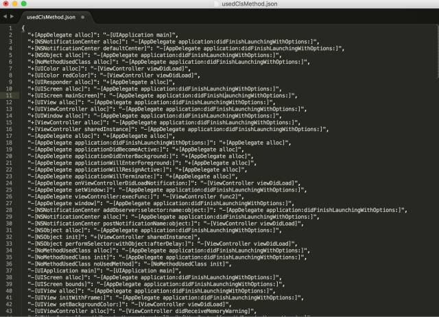 {-[AppDelegate alloc],"-[UIApplication main]","-[UIApplication main]","-[UIApplication main]","+[NSObject alloc]","-[UIApplication main]"},其中AppDelegate由用户传给Analyzer.分析所有含源码方法是否存在一条路可以被已经调用usedClsMethodJson中的key调用。