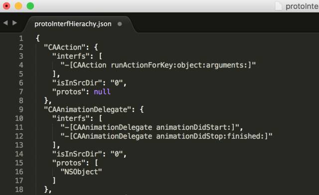 以AppDelegate为例,interfs代表其提供的接口(注:它的property window对应的getter和setter也被认为是interf一部分);isInSrcDir代表此类是否位于用户目录(将workspace的根目录作为参数传给clang)下,protos代表其遵守的协议,superClass代表接口的父类。