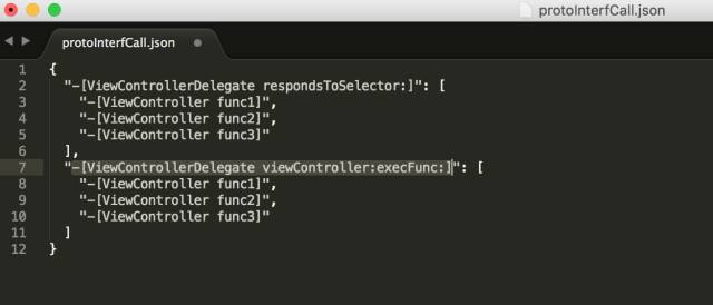 此数据结构记录了所有如:-[ViewController func1]调用了-[id\<ViewControllerDelegate\> viewController:execFunc:]的形式,最终结果如下所示: