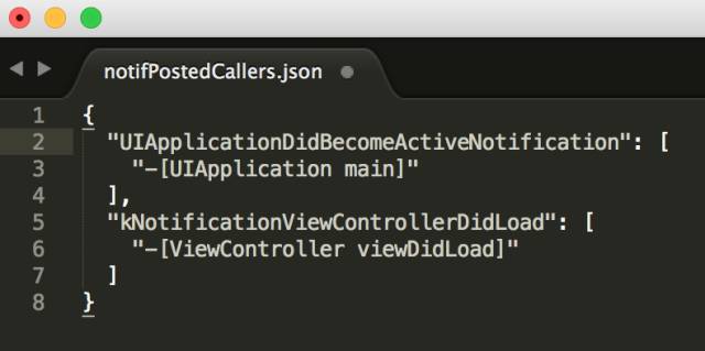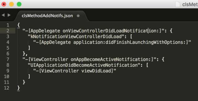 以第一条记录为例,其意思是说-[AppDelegate onViewControllerDidLoadNotification:]作为通知kNotificationViewControllerDidLoad的Selector,在-[AppDelegate application:didFinishLaunchingWithOptions:]中被添加。