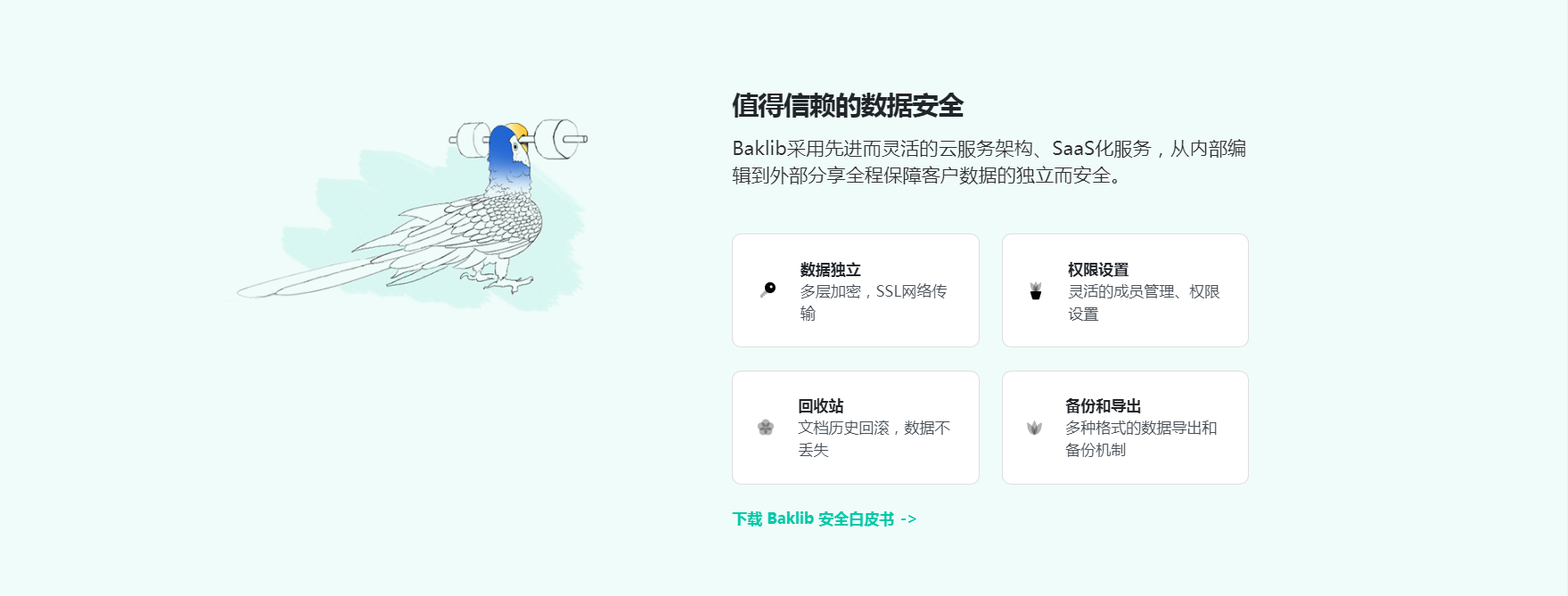 Baklib自创建之初,就始终以用户数据安全和隐私为最优先级别。默认内容为隐私状态,只有分享和发布内容才可被人阅读。可进行多人协同、成员权限管理、访问权限设置。