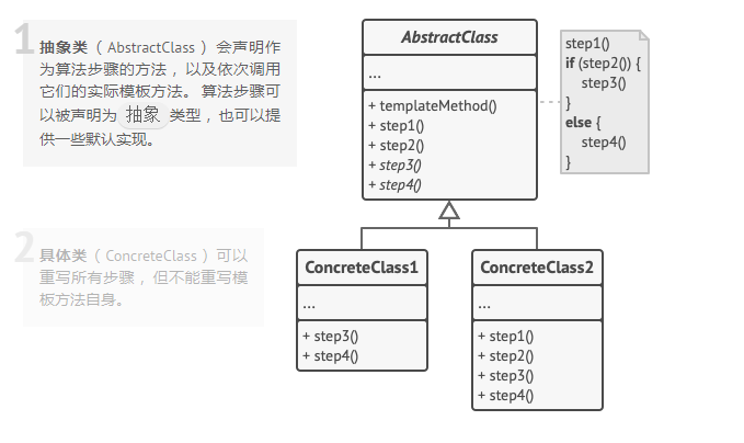 模板方法模式是一种行为设计模式, 它在父类中定义了一个算法的框架, 允许子类在不修改结构的情况下重写算法的特定步骤。主要要用来复用代码。