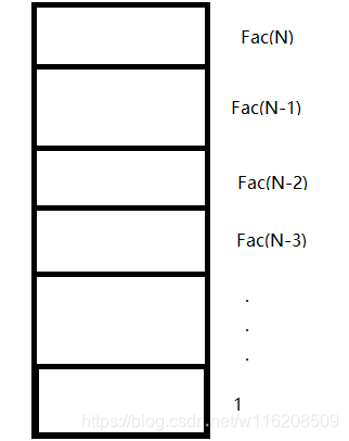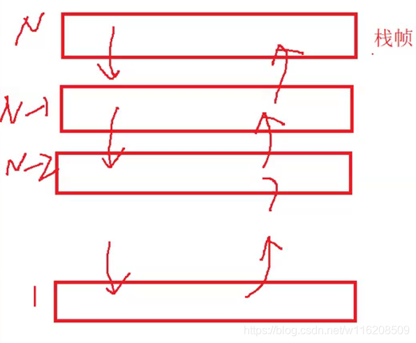 return N < 2 ? N : Factorial(N-1)*N; }对于我们的递归算法而言,其进行运算时会向下不断地开辟栈帧,最后返回时再一个一个销毁,所以我们的递归算法的空间复杂度通常是递归的深度,在本题为O(N)