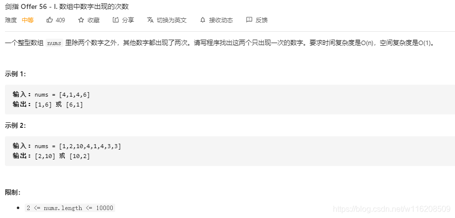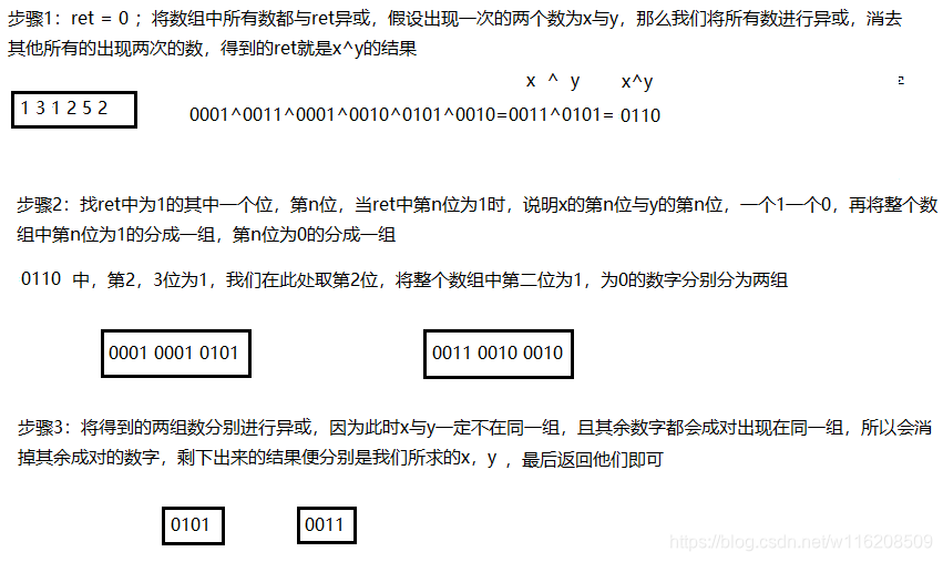 }这道题的核心思想是先将所有数异或得到那两个不同的数的异或结果,再根据结果中为1的位去确定那两个数哪一位不相同,再将数组按照那一位为0或为1分类,最后再次异或得到结果,本题主要考察对于位运算异或的熟练掌握,不是很容易想到