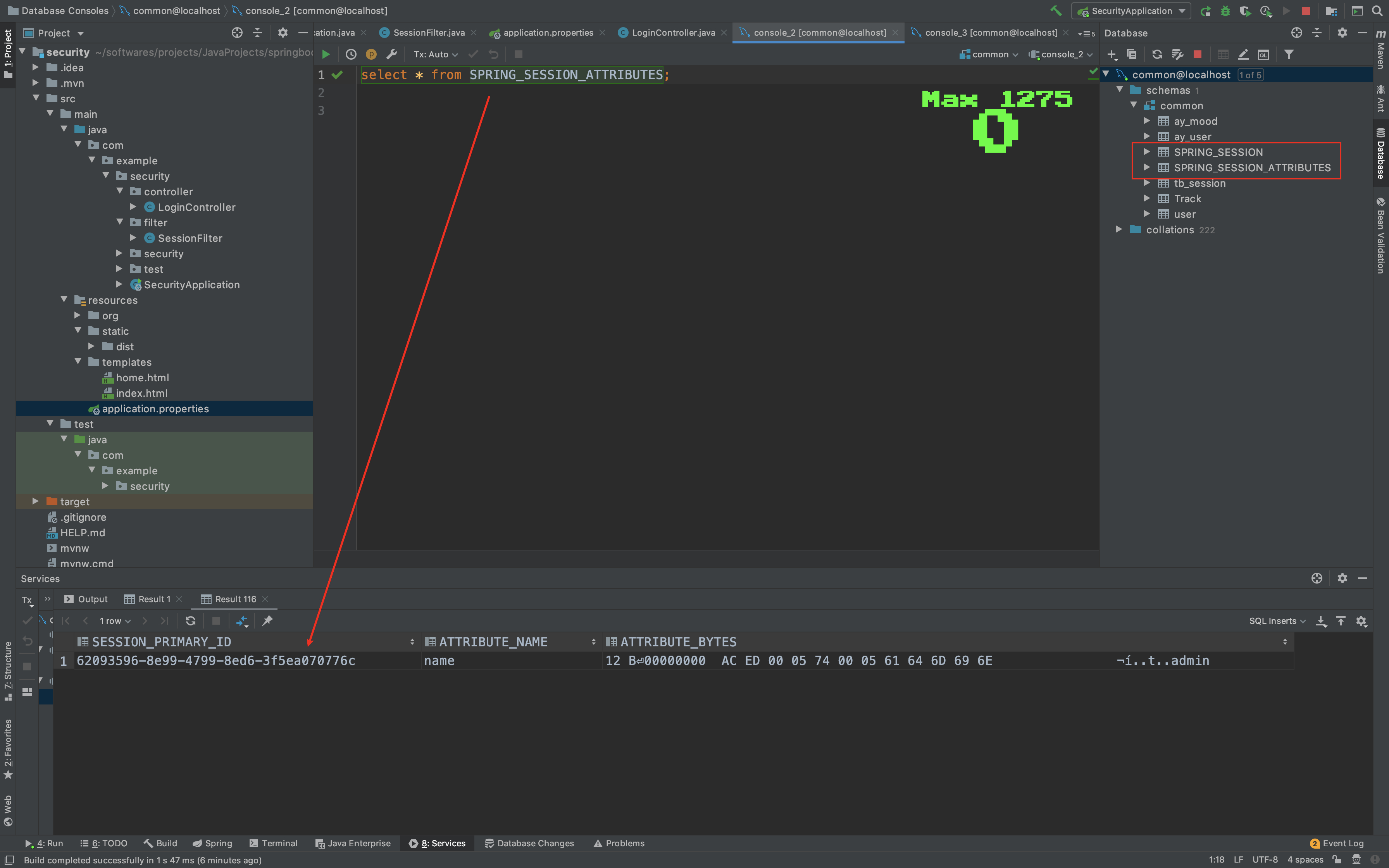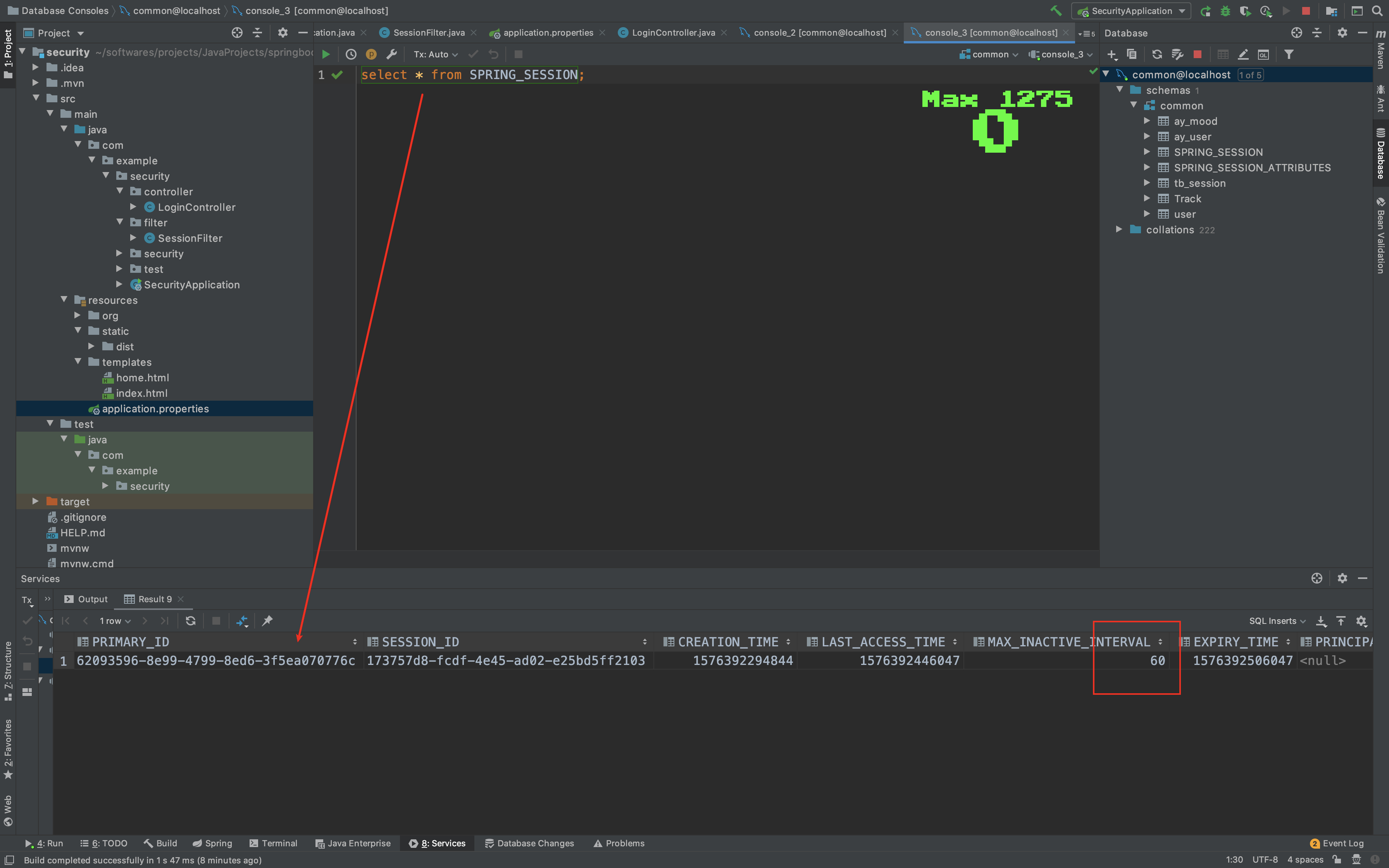 # 设置使用jdbc的方式存储session spring.session.store-type=jdbc # session 过期时间, 为了快速看到过期效果,我设置的60秒, 通常是设置为30分钟 server.servlet.session.timeout=60s # Database schema 初始化模式 spring.session.jdbc.initialize-schema=always # datasource schema spring.session.jdbc.schema=classpath:org/springframework/session/jdbc/schema-mysql.sql # 存放session的表名, 此表无须手动创建, spring会自己来维护session的添加和移除 # spring会通过上面设置的schema-mysql.sql进行自动创建保存会话的表名, # 前提是你的数据库要能正确配置, 我在下面配置了我的数据库 spring.session.jdbc.table-name=SPRING_SESSION # mysql数据库url spring.datasource.url=jdbc:mysql://localhost:3306/common?characterEncoding=utf8 # 数据库用户名 spring.datasource.username=root # 数据库 密码 spring.datasource.password=root # 连接数据库驱动 spring.datasource.driver-class-name=com.mysql.jdbc.Driver上面的Spring_SESSION表会根据schema-mysql文件自动创建,