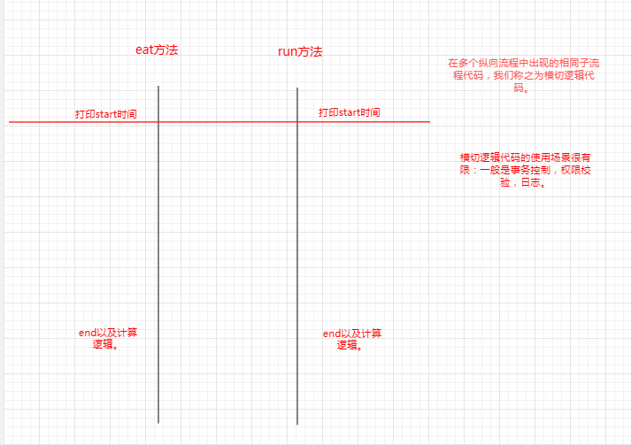 如图所示,run方法和eat方法均需要打印方法开始执行时间start及方法执行结束时间end,那么打印start的逻辑及打印end的逻辑就称为横切逻辑。