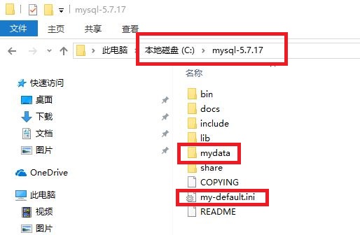 1、将mysql-5.7.17-winx64.zip安装包,解压并放置:C:\mysql-5.7.17,首先新建mydata空文件夹,用来储存数据文件。