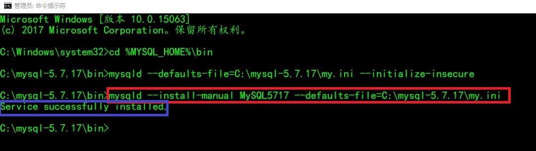 服务名称为MySQL5717,安装成功会提示:Service successfully installed