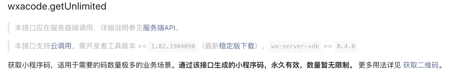 * 获取小程序码,适用于需要的码数量极多的业务场景。通过该接口生成的小程序码,永久有效,数量暂无限制
