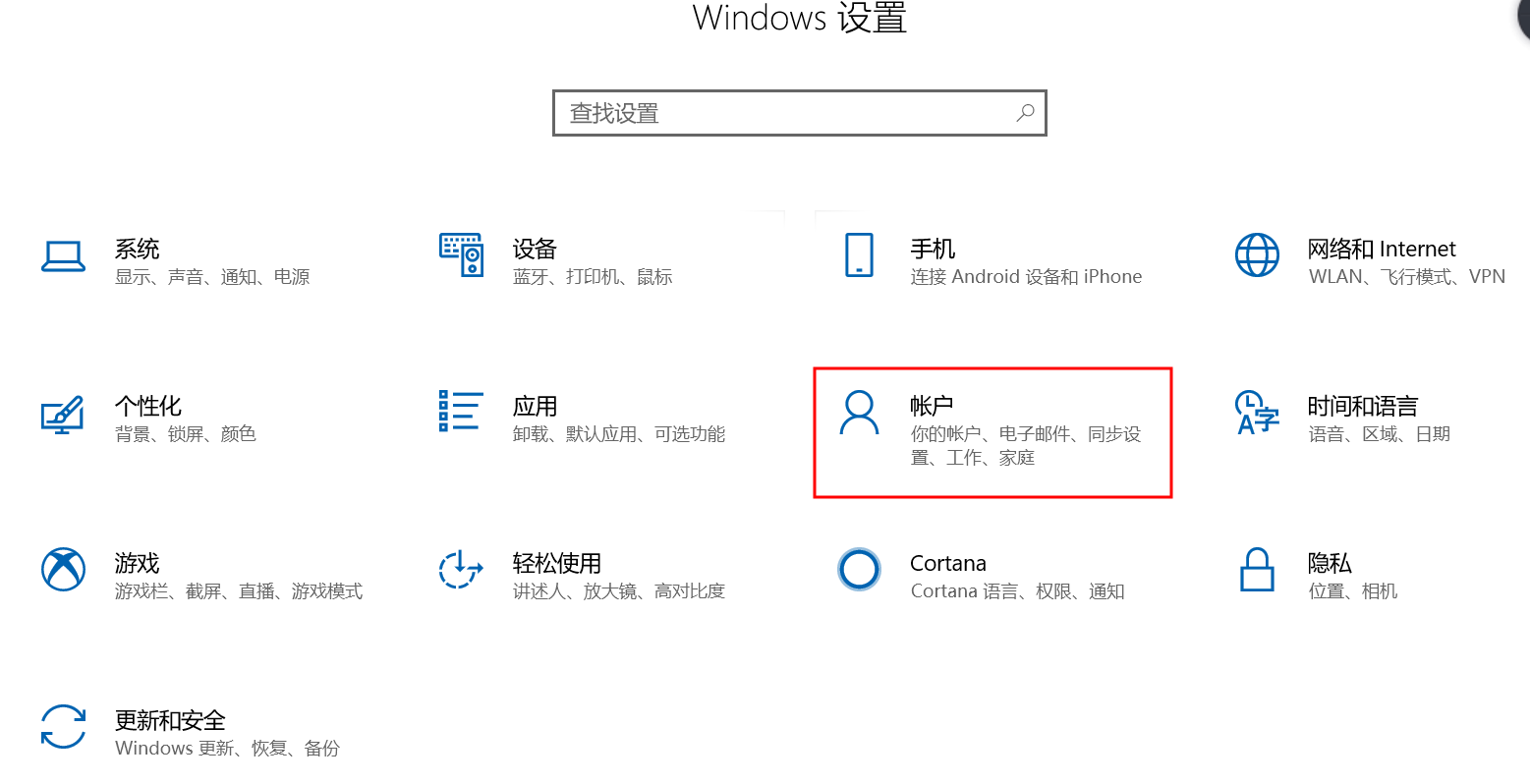 ②在设置选择中点击“帐户”