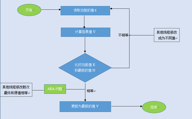 - 如果相等(在相等的时候有可能存在一个ABA问题,即可能在此过程中,该值被其他线程经过多次修改又恢复到了原来的值),则将内存的值更新为自己的结果值V; 对于ABA问题可以通过一些方式来知道(比如可以通过版本号来确定别人是否修改过该值)