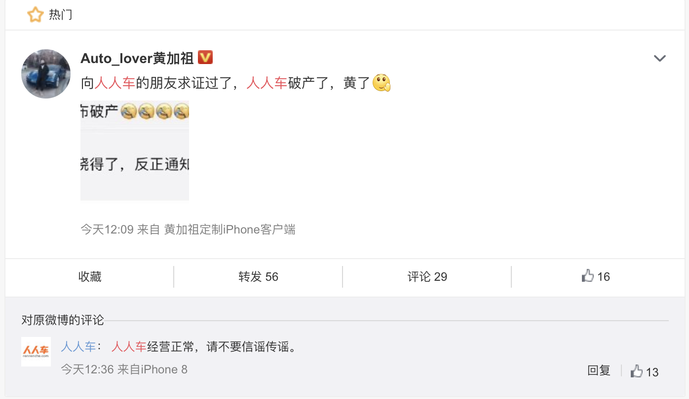 随后,官博在下方辟谣,称“人人车经营正常”。