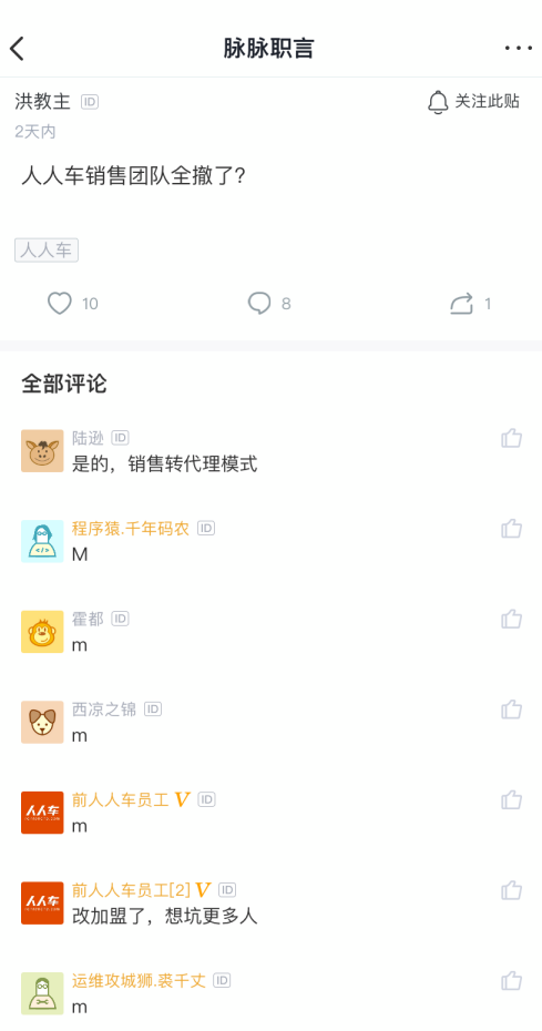 两天前,脉脉职言上曾有人爆料:人人车将改变销售模式,从销售转为代理(加盟),解散了销售团队。