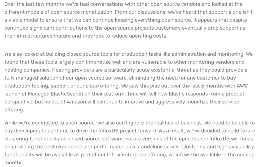 附InfluxDB三年前关于闭源其集群功能的一些考虑: