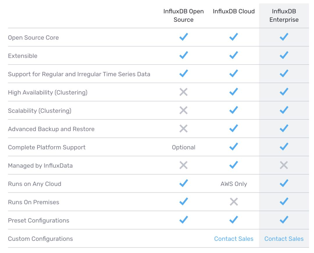 TDengine提供了三个版本的产品:社区版,企业版以及云版本。其中社区版是本次开源的单机版本,根据官方的介绍社区版拥有TDengine的大部分核心功能,是处理中小规模数据的理想平台。企业版在社区版的基础上新增了高可用、横行扩展等集群功能,内置异地副本复制功能,可用性达运营商级服务等级,提供更强大的运维管理工具。而云版本则为运行在AWS/阿里云上托管的企业版,按月付费省掉了你自己部署和系统运维的工作。类似的,行业里另一个比较流行的开源时序数据库InfluxDB也同样提供了三个版本的选择:开源的单机版,商业的集群版以及云版本,功能对比如下图。