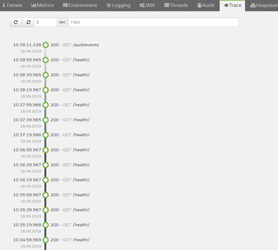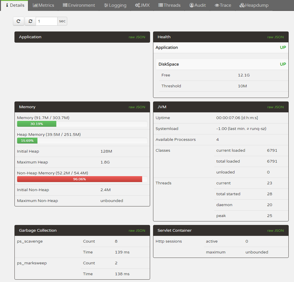 还有logging,还有JMX,我们一个一个来看一下,首先是一个details,这里主要是监控应用的详细信息,你看这里也有Health,