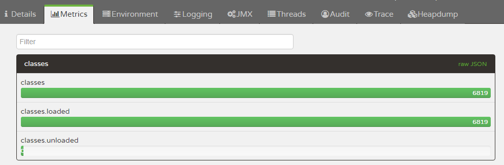 Metrics是对我们当前监控的应用,做了一个分明别类上的概念上的统计,比如第一个是classes,当前你的应用