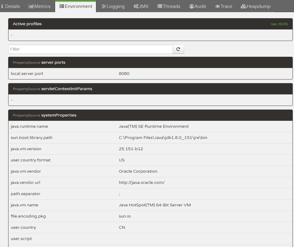 可以看到监听的端口,还有java.runtime.name,还有JRE环境的路径,版本,这都是一些JVM的信息