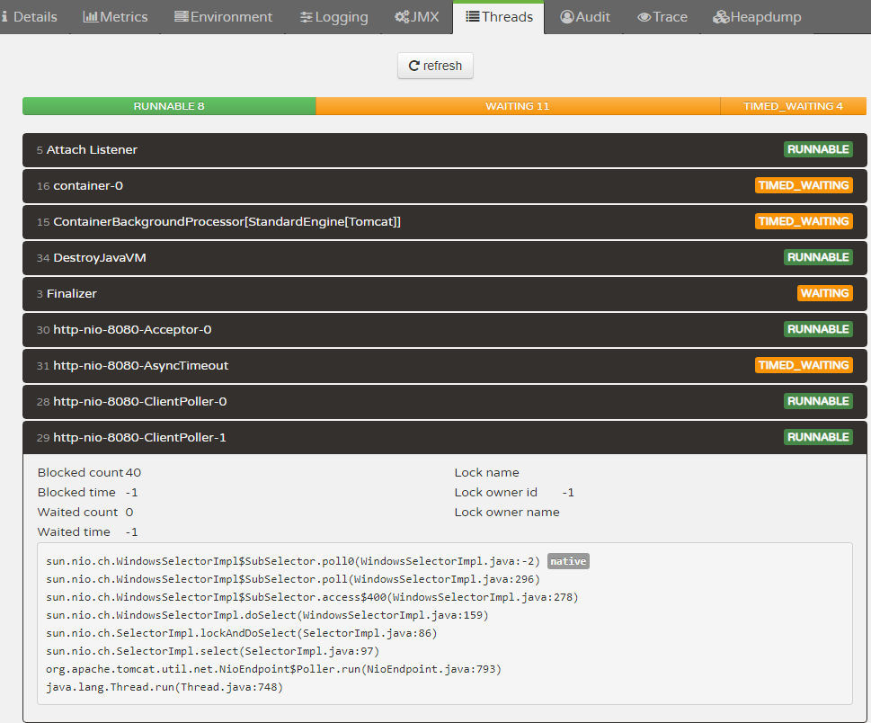 duump里看到的信息,他都是以JSON格式串来看的,而在springboot admin里面,就是可视化视图下,RUNNABLE正在运行