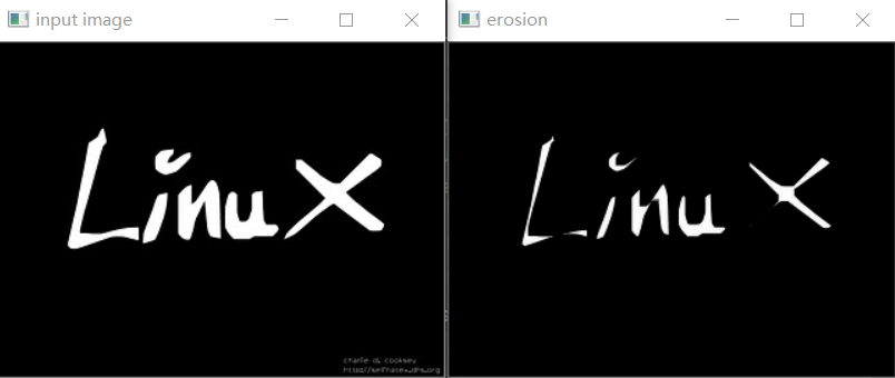 就像土壤侵蚀一样,这个操作会把前景物体的边界腐蚀掉(但是前景仍然是白色)。这是怎么做到的呢?卷积核沿着图像滑动,如果与卷积核对应的原图像的所有像素值都是 1,那么中心元素就保持原来的像素值,否则就变为零。这会产生什么影响呢?根据卷积核的大小靠近前景的所有像素都会被腐蚀掉(变为 0),所以前景物体会变小,整幅图像的白色区域会减少。这对于去除
