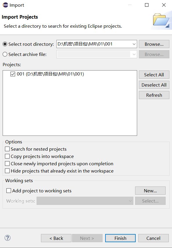 4.选择你项目包,点击Browse...选择你项目包保存的位置,如图我的存储位置是D:\机密\项目包\MR\01\001。(而不是选择001内的文件)。