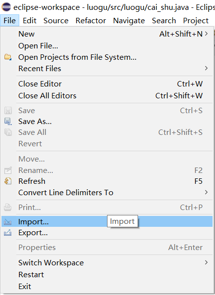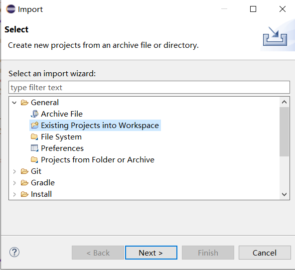 3.点击import,选择General-Existing Projects into Workspace-Next,如图所示: