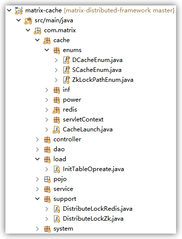 DcacheEnum.java定义了数据字典相关枚举信息,ScacheEnum.java定义了业务字典相关枚举信息。CacheLaunch.java是整个缓存的入口类。DistributeLockRedis.java提供基于Redis的高性能分布式锁,DistributeLockZk.java提供基于Zookeeper的高可靠分布式锁,这两种锁可以根据具体的业务场景,自由选择。