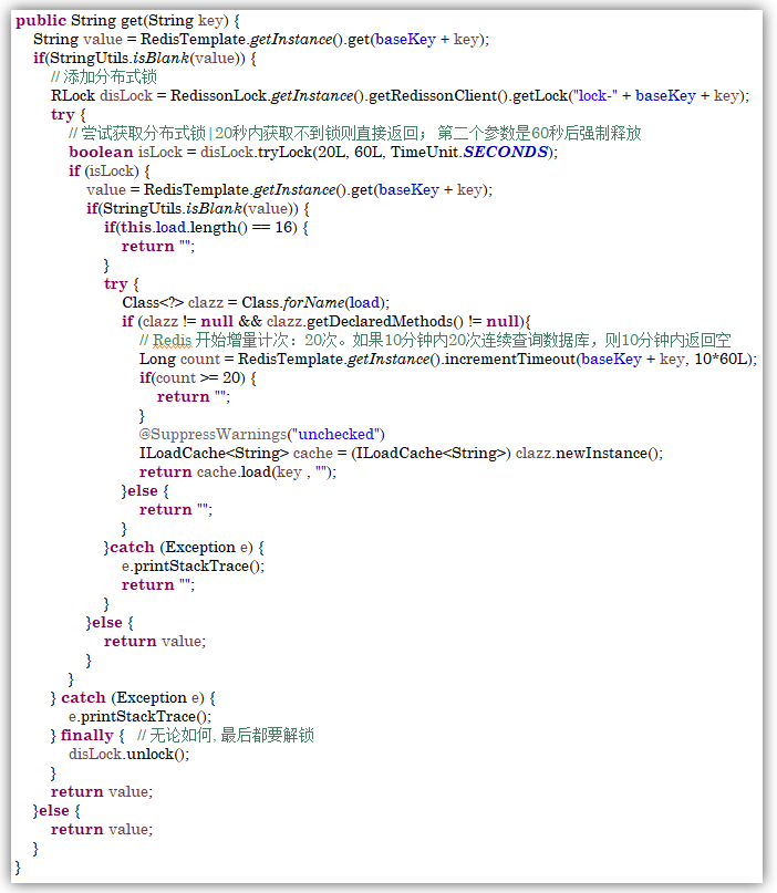 缓存底层把数据库查询、拼接数据的业务的代码统一归纳到一个具体的处理类中,这么做的好处是查库放到缓存的这个过程,只有一个入口,业务开发人员不必担心会有多个地方存在同一个缓存的获取行为,以架构约束的方式,将与业务代码无关的缓存获取操作从Spring的Service层中分离出来,单独保存,最大限度的减少因为遗忘、疏漏而产生的缓存不同的问题。同时,此方法做了防穿透处理,如果一个缓存Key在10分钟内尝试20次连续的数据库查询操作,那么将会在10分钟内连续返回空字符串;也就是说业务开发人员无需在实际业务开发中再考虑缓存穿透的问题。