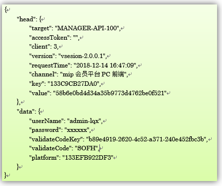 target:api标识符 accessToken:登录后的令牌,过期时间半小时 client:3代表客户端,固定值 version:版本号,vsesion-2.0.0.1,固定值 requestTime:本次请求发起时间,md5加密依据之一 channel:渠道,固定值 key:公钥,由Leader平台系统进行分配 私钥:此处不体现,由系统分配给对应客户端的请求者。 value:md5加密后的结果。 data:请求所携带的参数,其中platform为固定值,每个平台对应的值不同,由数商管理平台统一分发。