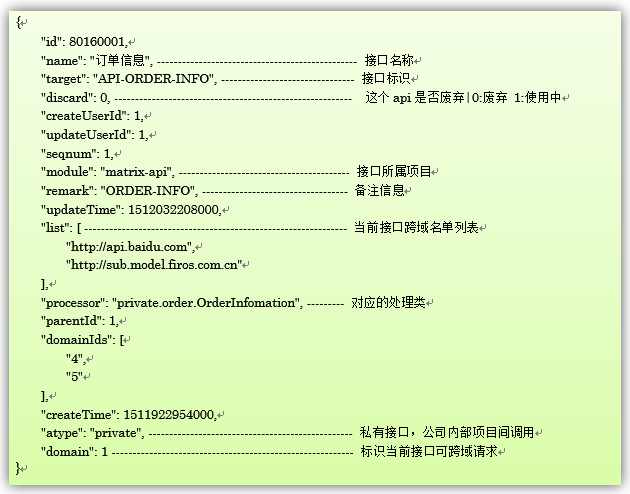 在系统设计中,所有的API信息均以缓存的方式存在于Redis中,每一个接口都可以针对指定的域名进行跨域操作,接口间的跨域问题由底层统一解决,不用开发者处理。完整的API JSON结构信息如下: