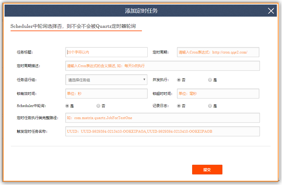 为分布式定时任务提供支持。基于Quartz,系统对其再次进行了高度封装,使得开发人员可以轻而易举的完成定时任务的开发工作。在矩阵后台,有非常人性化的界面来配置、修改、查看和关闭你想要操作的定时任务。