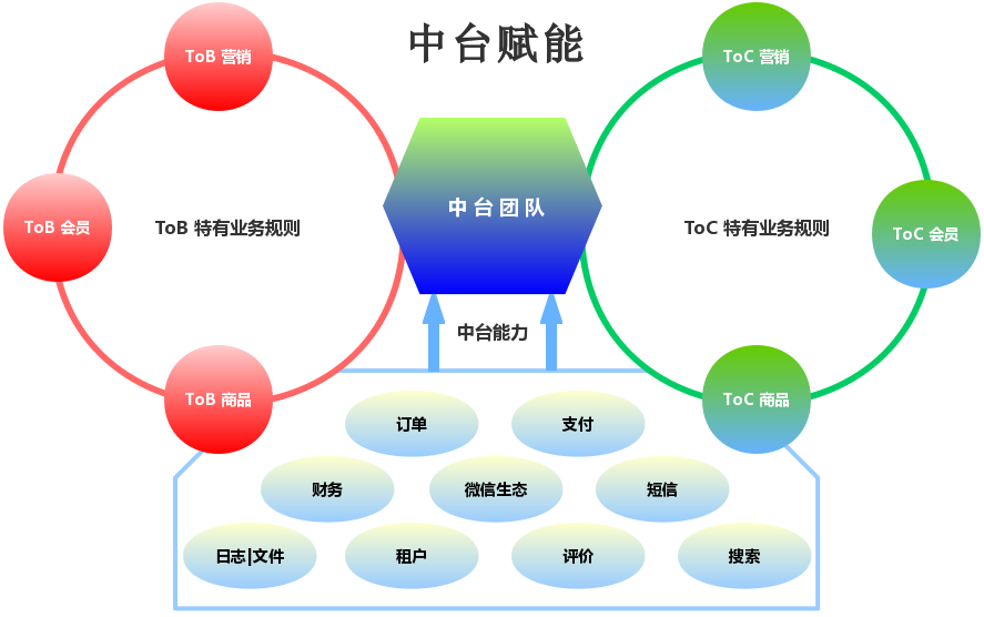 中台是一个为公司提供后勤保障的角色,那么谁是我们的部队和士兵呢?我的答案的是公司中的业务方。业务方去销售我们公司的产品,他们就要和“战场”中的友商拼命厮杀,买了我的产品客户就不会用你的产品,我多吃一口你就少吃一口。市场就这么大,客户就这么点儿,有你没我像极了一场战争。业务方在面对瞬息万变的市场环境时肯定需要根据市场反馈及时做出业务上的调整。通常来讲中台提供的能力是可复用的,特定业务上的调整并不会造成多少影响,我们只需要调整业务代码即可。这种情况下工程师们加的班都是有意义的,技术部门与业务方相辅相成共同完善产品,和谐了~