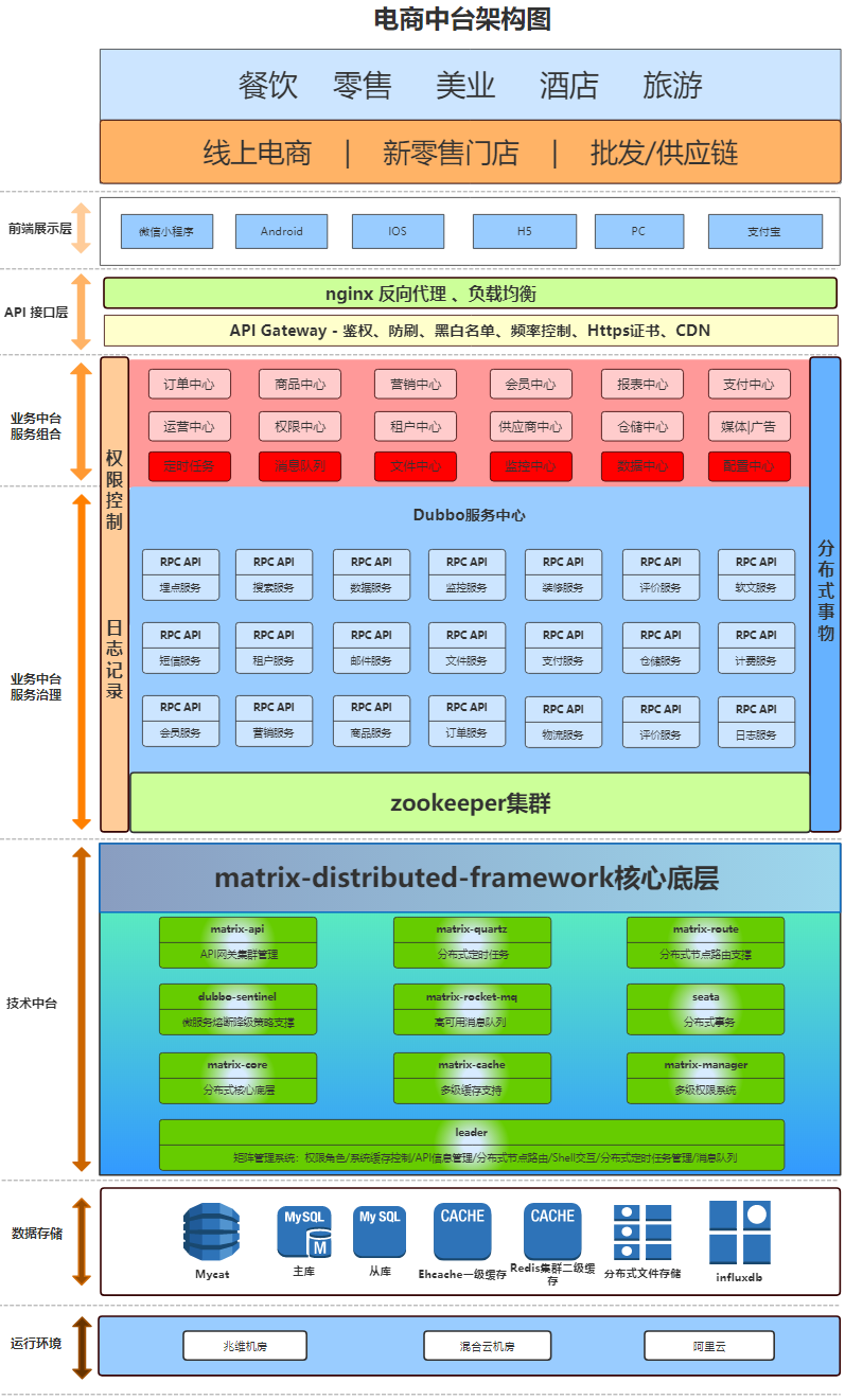 依托技术中台,提供了API的统一入口项目、基于Quartz二次封装的分布式定时任务、服务节点路由、服务降级、分布式消息队列、分布式事物(seata目前尚不稳定,还需要继续跟进)、多级缓存、统一的权限账号体系、核心底层matrix-core和开发控制台:矩阵分布式管理系统(leader)。matrix-distributed-framework是我们的技术中台,译为矩阵分布式框架;这个名字是根据哥德尔命题来的:在任何矩阵系统中,总有真理游离于逻辑之外。之所以这样说是因为一个系统也好、平台也好无论设计的多么完美(至少在你看来),他都会有自己的缺陷和漏洞。