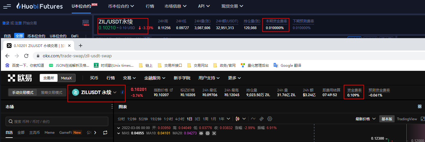 huobi和okx,ZIL资金费率,相差0.09%左右,假如在huobi做多,okx做空,那么理论收益是0.045%,一天三次就是0.135%,年化 0.135*365=49.275%。