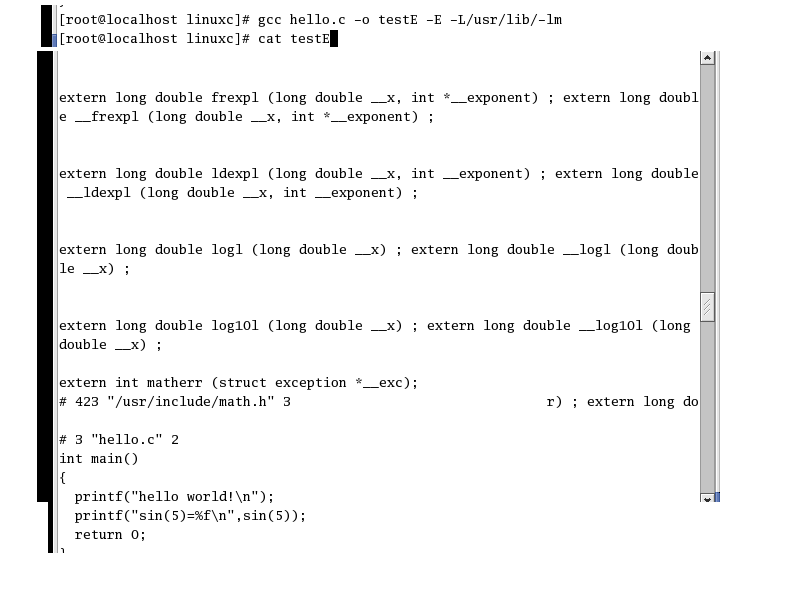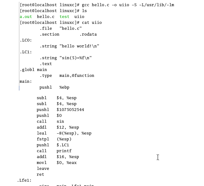 #include <stdio.h> #include <math.h> int main() { printf("hello world!\n"); printf("sin(5)=%f",sin(5)); return 0; }输入 gcc hello.c -lm ,将会生成绿色的a.out文件