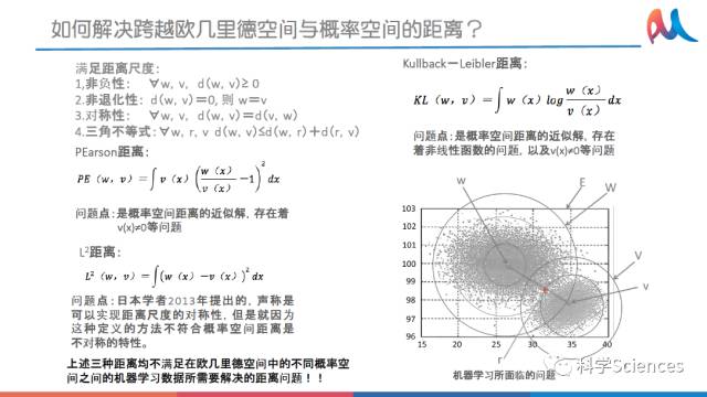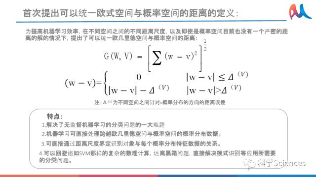 第一,面对我们现在在人工智能当中所面临的数据,人工智能的是概率分布,是无数个空间关系问题,归根到底,人工智能要解决两个概率分布中间有一个数,这个数属于谁,这是最基本的问题。在这里就遇到了概率空间具体问题,大家也说了,概率空间距离数学家们搞了很多,但是今天咱们不讲这个问题,简单讲一下都没有走通,到最后都进行了某些化简,2003年日本一个学者自己又定义了一个模型。所以,我们可以看出,从数学角度上想找到一个不同距离尺度的公式是非常难的。我们在大量的应用实践当中发现,作为一个数据,从欧几里得空间进入到概率空间的时候,它产生了什么误差,我们从这个角度找到了误差的表达公式,我们就构建了一个非常严谨的,在欧几里得空间的、各个概率空间之间的距离,我们看这个公式,如果仅看上面就是欧几里得的距离公式,下面得出的值是数据进入概率空间之后的误差,用这个简单的办法解决了实体当中的应用。