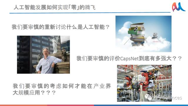 第三,产业界不是光要图象识别、声音识别,我们机器当中有很多环节,今后在各个环节上都要用上人工智能。产业应用是各种各样情况的,各种各样的情况要用各种各样的模型,各种各样的模型要靠我们在座的每一个人自己来创造模型。大家说中国宣布了四个大平台,大家很担忧,是不是又被垄断了,我马上回答说不一定,因为CapsNet的观念大家理解了,我们每个人都可以造平台了,你的平台没有人用了。