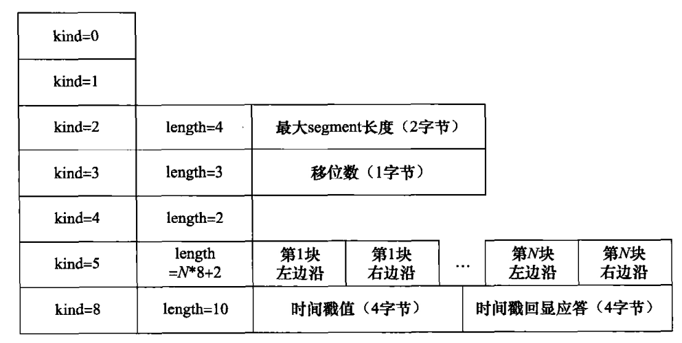 (6)kind=5:是SACK实际工作的选项。该选项的参数告诉发送方,本端已经接收到的不连续的数据块,从而让发送端据此检查并重发丢失的数据块。每个块边沿(end of block)参数包含一个4字节的序号。其中,块左边沿表示不连续块的第一个数据字节的序号,而块右边沿则表示不连续块的最后一个数据字节的下一个字节序号。这样一对参数(块左边沿和块右边沿)之间的数据就是没有收到的。因为一个块信息占8字节,所有TCP首部选型中实际上最多可以包含4个这样的不连续数据块(考虑到选项类型的长度占用的2个字节)。
