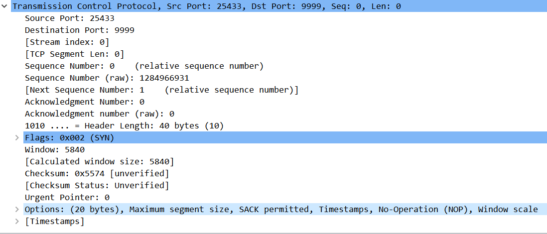 由上图可以看到,TCP报文段首部各个字段的信息,该报文段的首部长度是40字节,其中包括固定的首部长度20字节+选项字段20字节长度。标志位Flags中,只有 SYN=1,其他标志位均为0。初始序号值为0,确认号为1,接收窗口值为5840,检验和字段为0x5574,紧急指针字段为0。