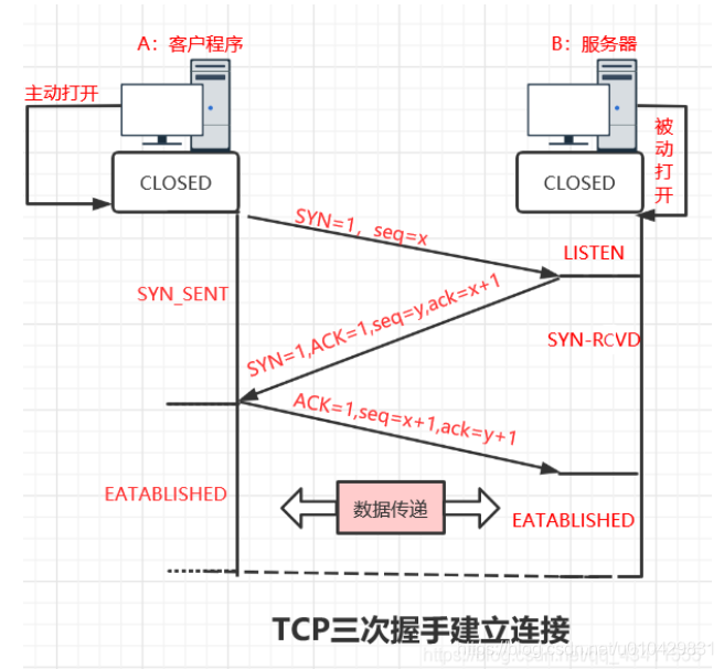 下图是TCP三次握手建立连接的过程,假定主机A运行的是TCP客户程序,主机B运行的是TCP服务器程序。最初两端的TCP进程都处于关闭(Closed)状态。注意:A客户端主动打开连接,B服务器被动打开连接。