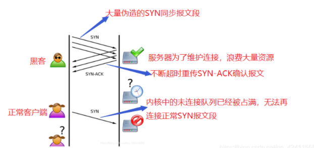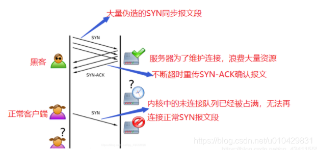 半连接:在TCP连接建立的三次握手过程中,主动发起连接请求的一方不发最后一次的ACK确认报文,使得服务器端阻塞在 SYN-RCVD(同步收到)状态。