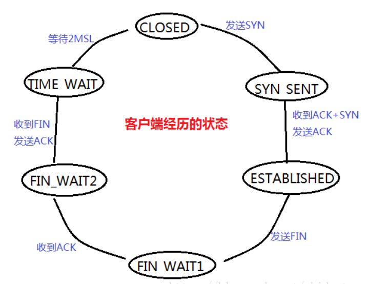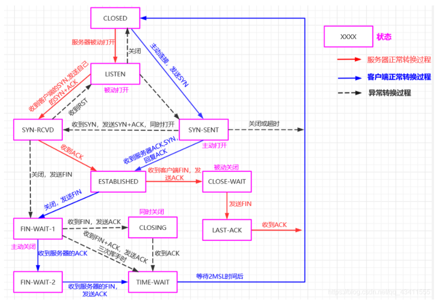 说明:紫色框框是TCP状态,红色是服务器进程的正常状态转换,蓝色是客户端进程的正常状态转换,黑色是异常变迁,即出现问题时的状态转换。