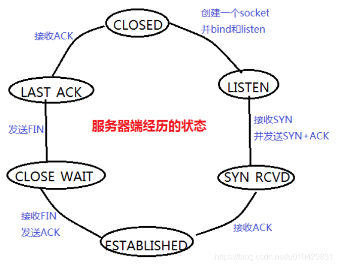 - LAST-ACK —> CLOSED:当服务器收到客户端对自己发出的FIN结束报文段的确认报文段后,服务器关闭TCP连接,进入 CLOSED 状态。