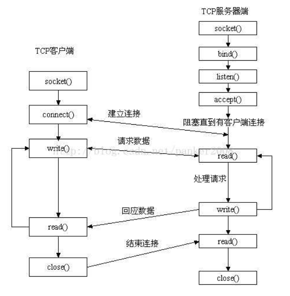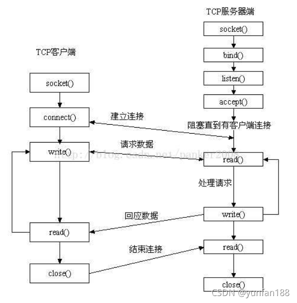 服务端进程调用函数顺序:socket—>bind—>listen—>accept。当执行到accept()函数时,服务器进程会一直处于阻塞状态,直到有客户连接请求到达才返回。