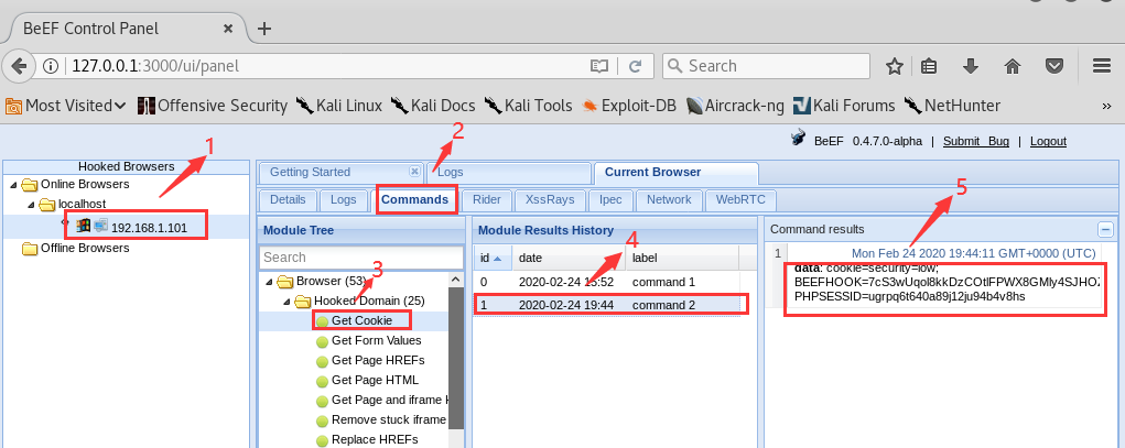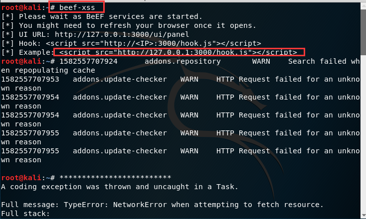 1、打开kali的命令行,输入:beef-xs,获得一个js脚本,并跳出beef登录界面,输入用户名和密码(默认都是beef)